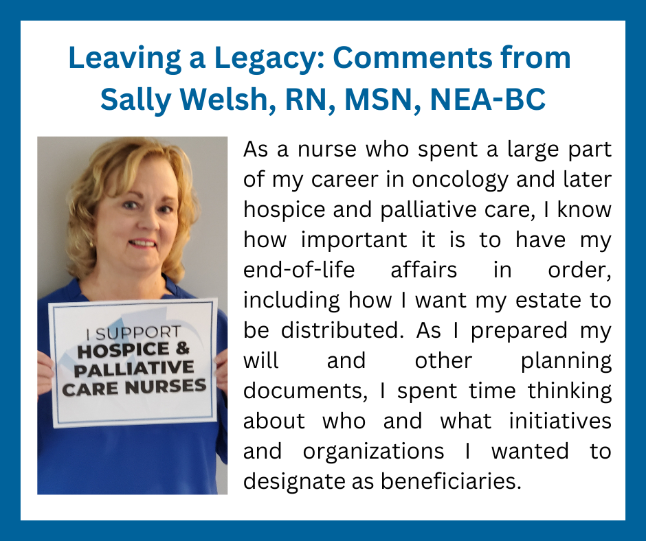 Each of us will leave a legacy, something nurses working in hospice or palliative care may realize more than most others. When considering your own legacy, planned gifts to HPNF enable you to support hospice and palliative nursing care for generations to come.